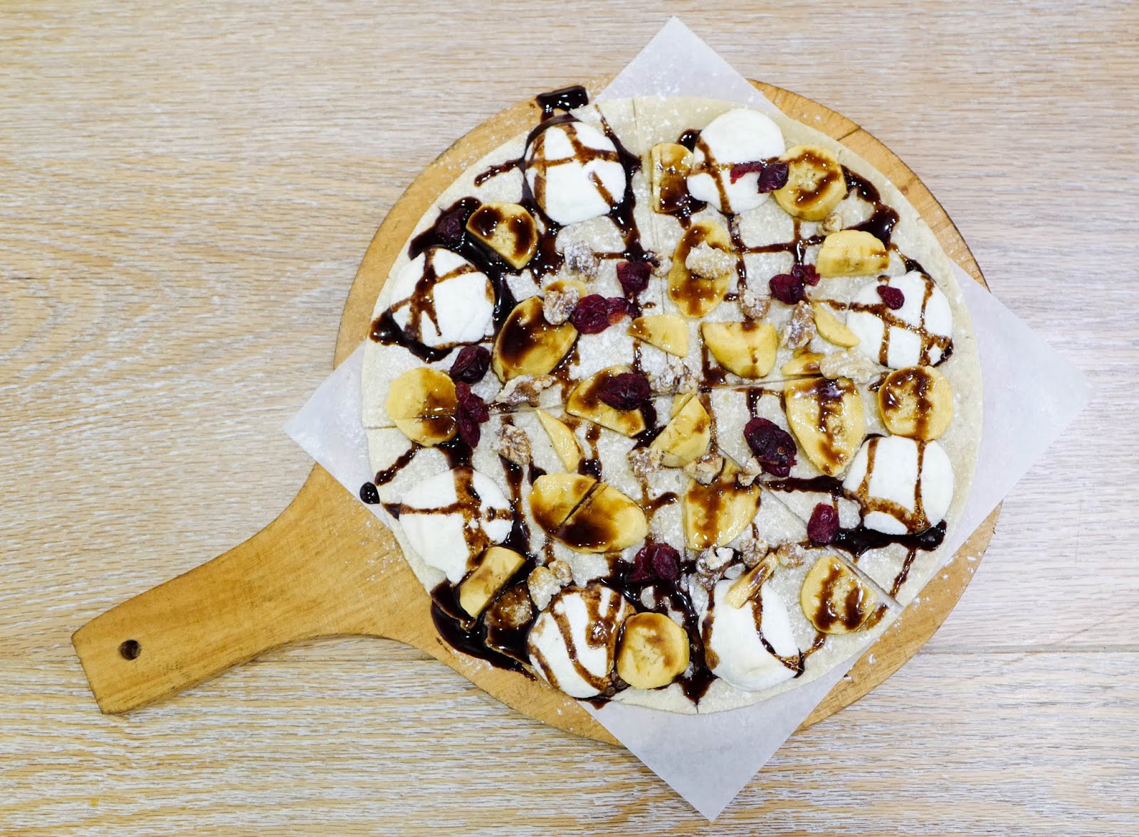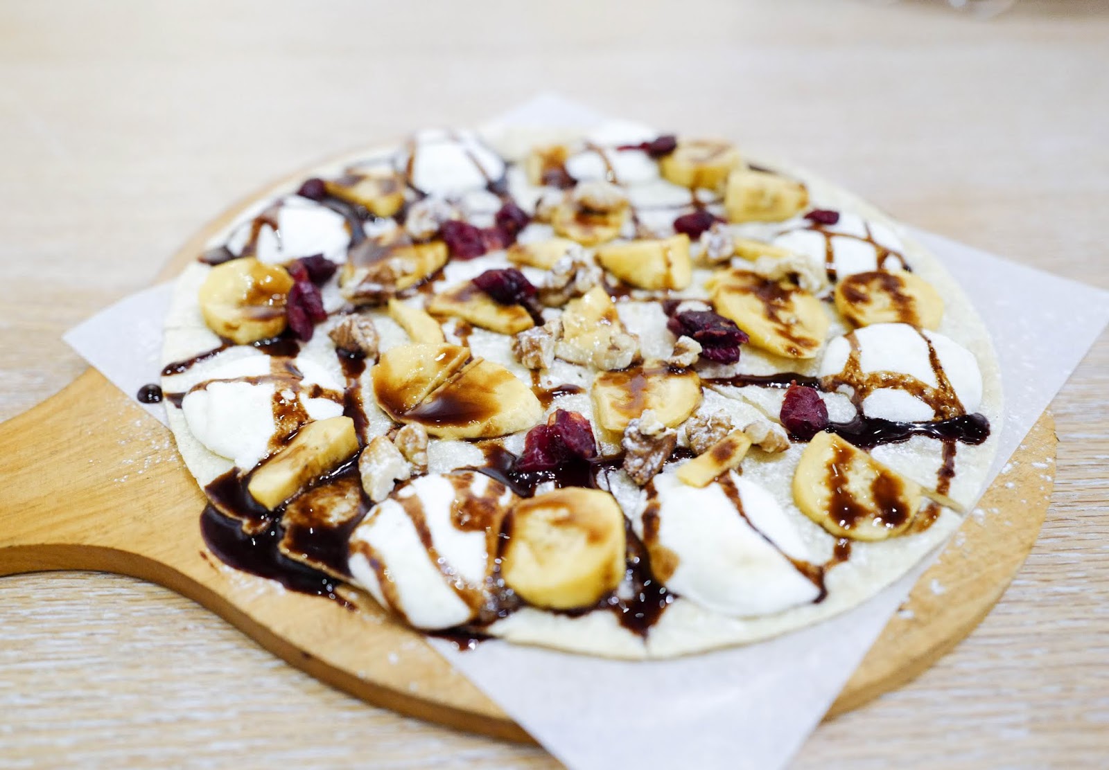 ... and finish with the Walnut and Chocolate Banana Pizza, a thin-crusted creation sweetly topped with toasted walnuts, bananas and raisins (RM 19.80). Fans of savoury pizzas can always opt instead for the likes of the Margherita or Smoked Duck Pizzas.