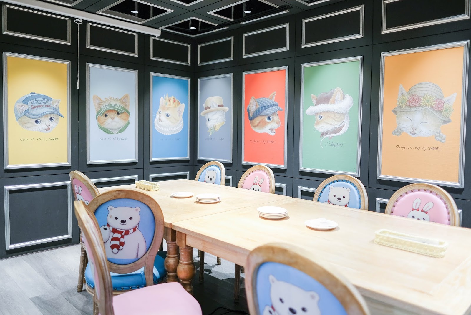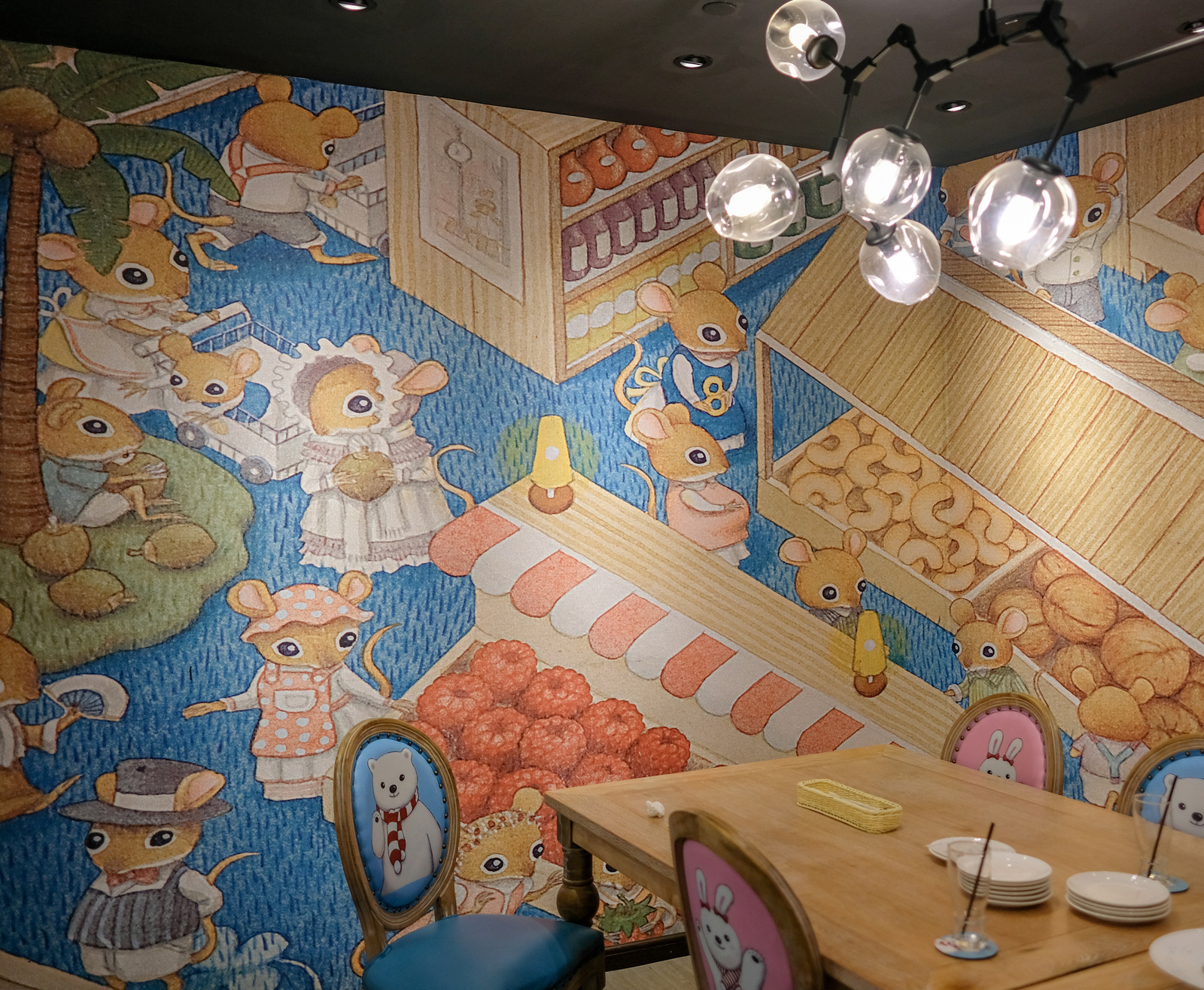 Murals of polar bears wandering through a forest line this whimsical restaurant, alongside rooms where cute cartoon cats and mice frolic on the walls. As you pull up your chair, you might be charmed by caricatures of reindeer and bunnies on the back of the furniture.