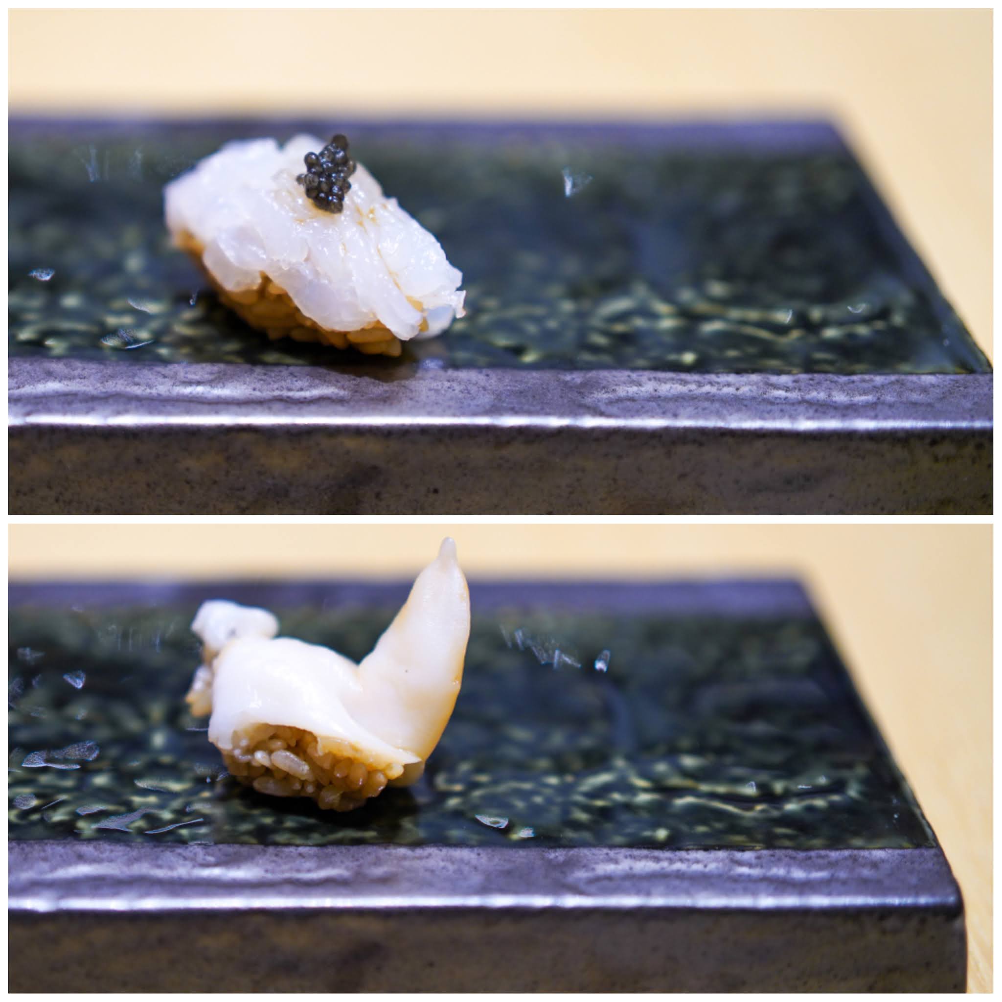 Fish is respectably represented by kinmedai, the light, flaky golden-eye snapper, layered thickly over notably vinegared rice, and engawa, the decadently buttery-oily flounder fin.
