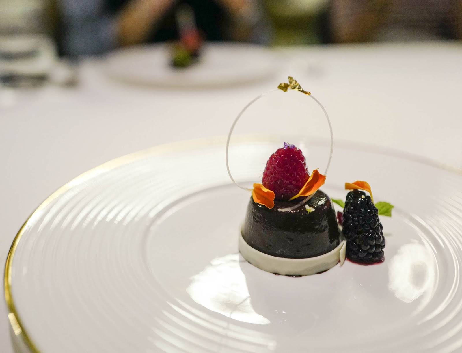 The two possibilities for dessert are thoughtfully varied. The Apple Caramel Sorbet takes centre stage, its smooth, mellow softness bolstered by chantilly jivara, velvet meringue and lavender streusel for more complexities than typically crammed into a dessert, while the Marquise is a sure-fire crowd-pleaser, made from Cuvee Bali 68 percent chocolate, coupled with hazelnut dacquoise for a delectable dose of decadence. Plenty of petit fours help the night conclude on a satisfying high.