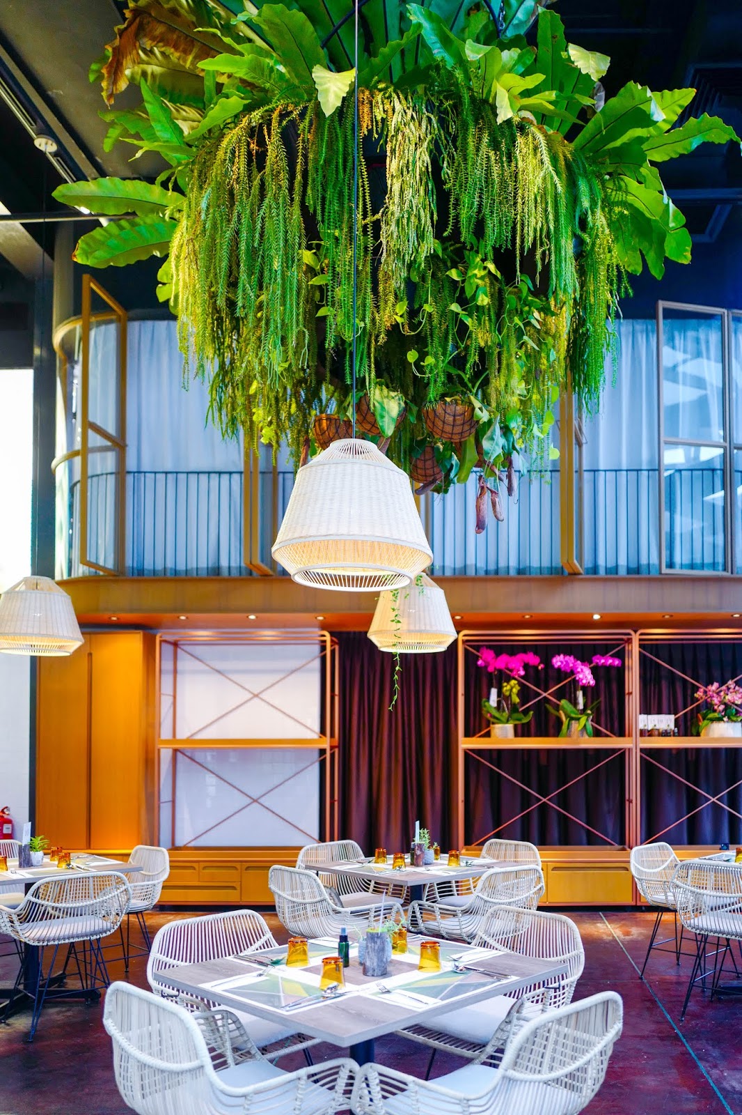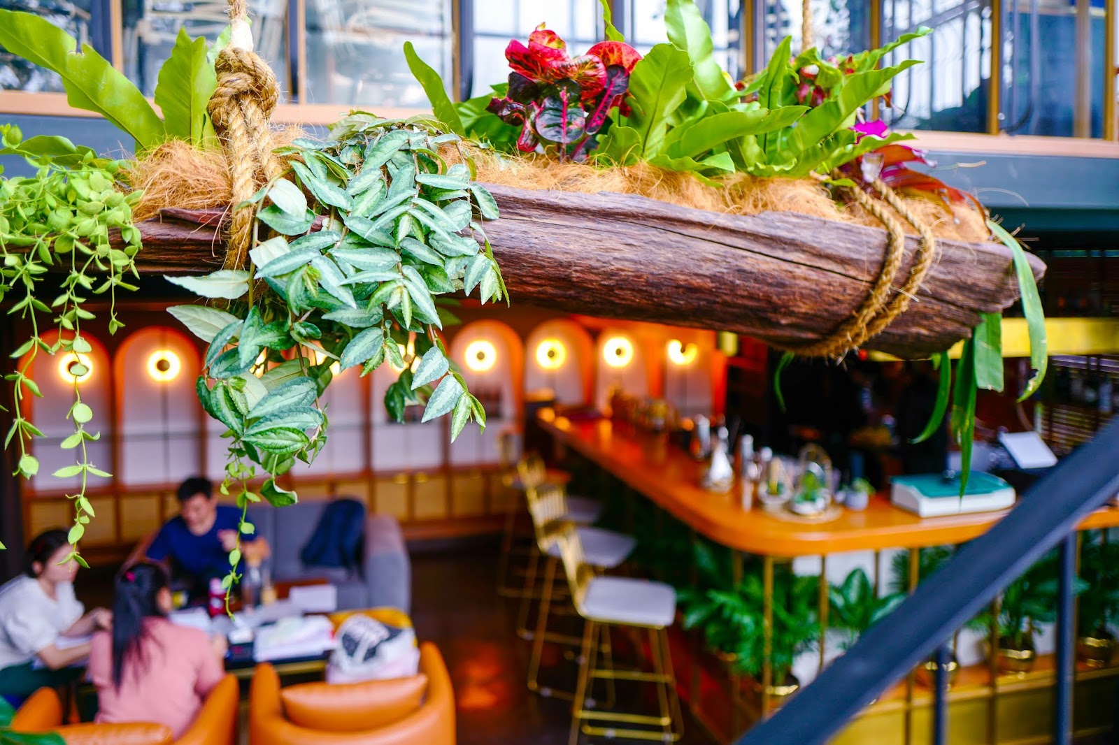 The main hall is called the Farmhouse, a glasshouse filled with rattan and repurposed furnishing, with the soaring ceiling's centrepiece of a 'chandelier' layered with seven plants, including bird's-nest ferns, kangaroo pocket leaves and monkey cup pitchers.