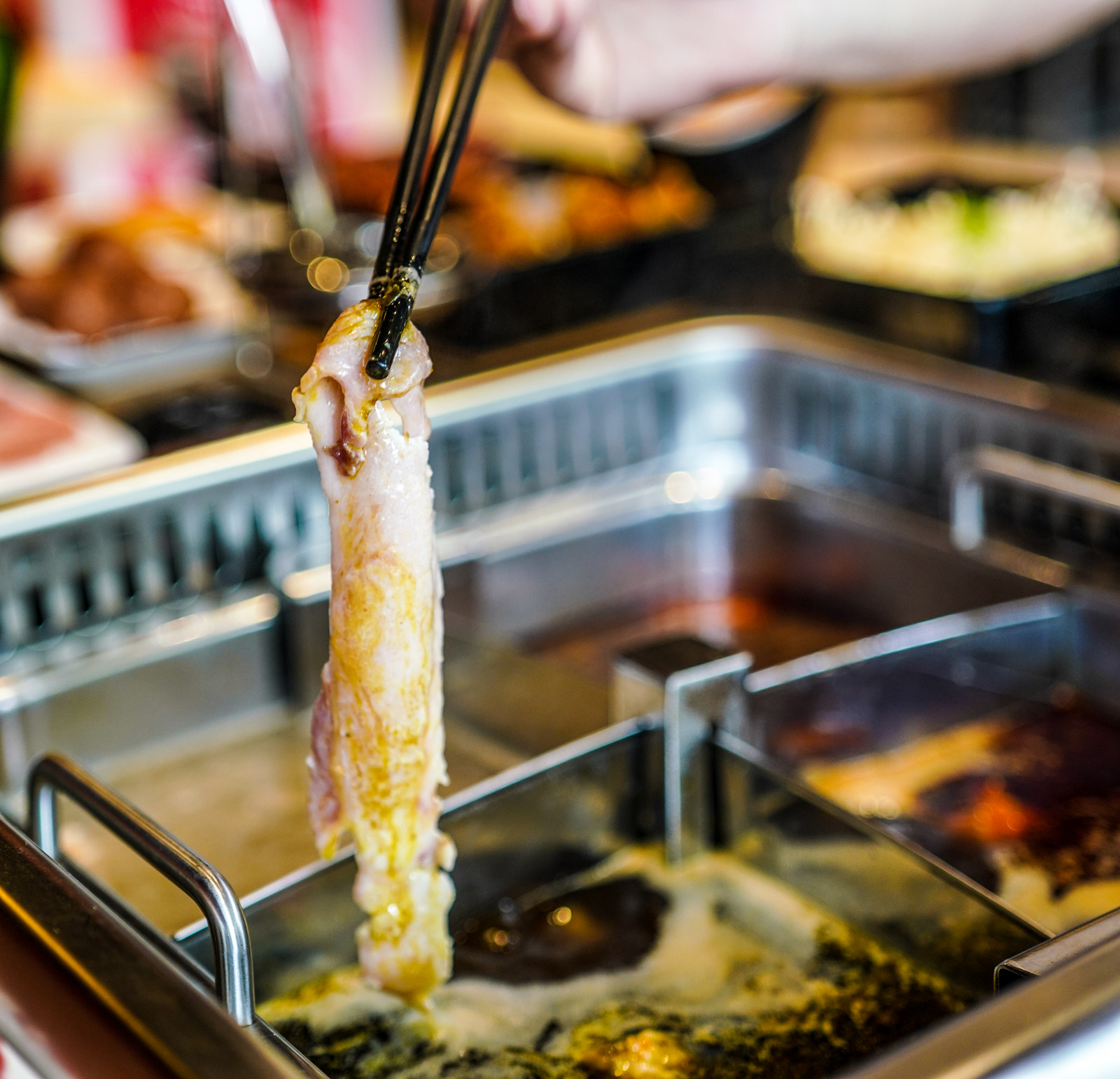A meal here is a comfortable, customisable affair. Every hotpot on each table is equipped with automated elevation strainer trays that can be activated with the touch of a button, enabling ingredients to be buoyed above the broth for convenient consumption.