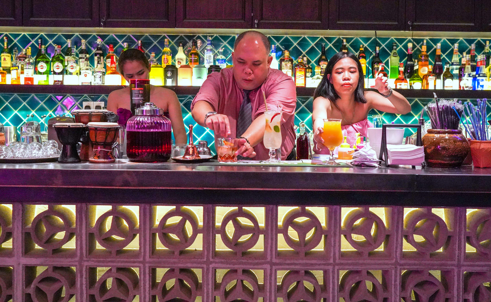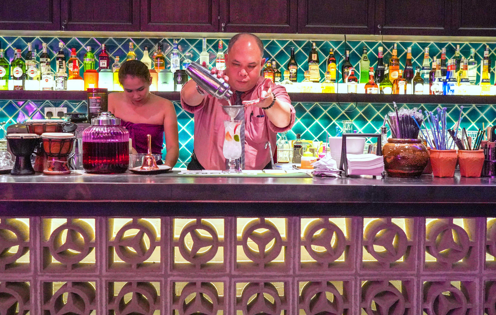Thai elements abound, in treasures like the Tub Tim Gem (Thai homemade herb whiskey, lime, mint) and Tommy's Tom Yum Thai (vodka, lime, lemongrass, galangal, kaffir lime). Beverages prove well-balanced and potently refreshing, notably the Bussaba (tequila, mango, passion fruit, lychee, lime) and the Bussarakam Gem (butterfly pea-infused vodka with bourbon, bianco, apple, lime and pandan, presented in ice to keep it cool even if the conversation runs long).
