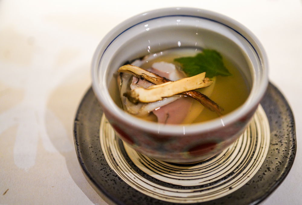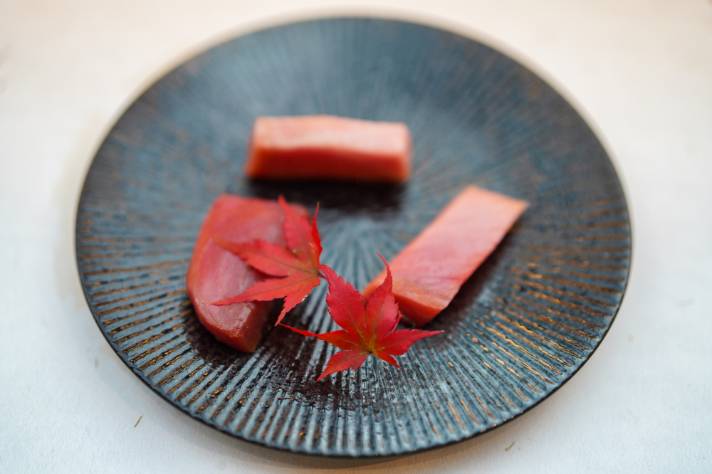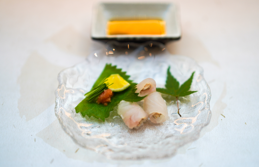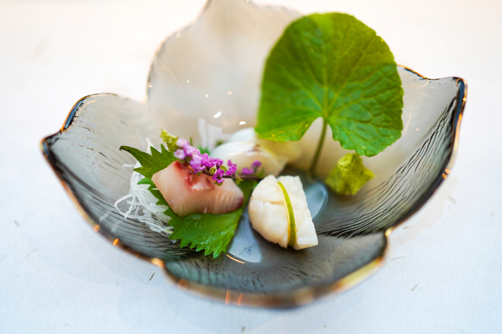 We counted no fewer than 10 pre-sushi courses, gliding gracefully from raw and preserved to poached, grilled and fried, garlanded elegantly with leaves and flowers, fruits, vegetables and nuts.