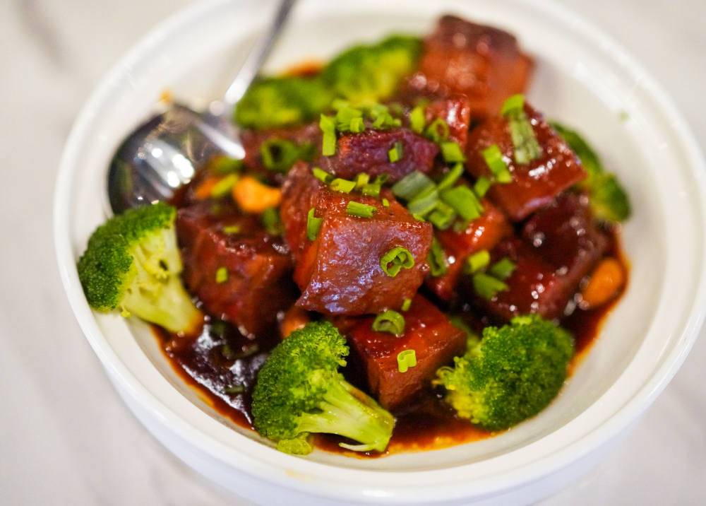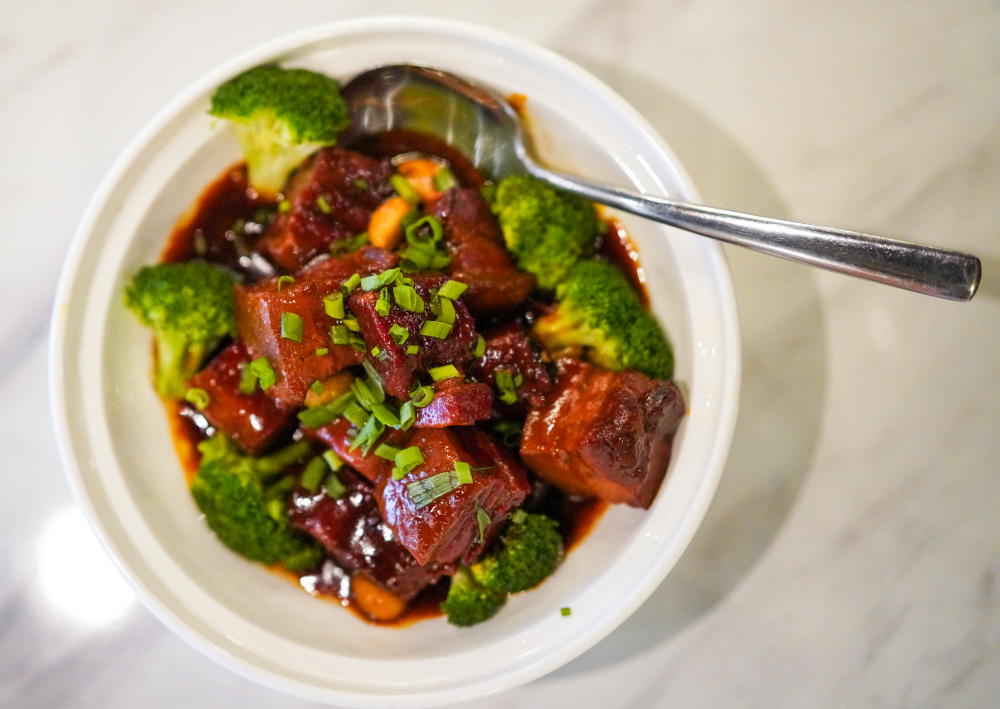The belly is beautifully tender, with the perfect proportion of gelatinous glory, not greasy at all, buoyed by braising that lets the meat soak up all the seasoning in its succulence, balanced for broccoli for a dish that the entire family will devour ecstatically.