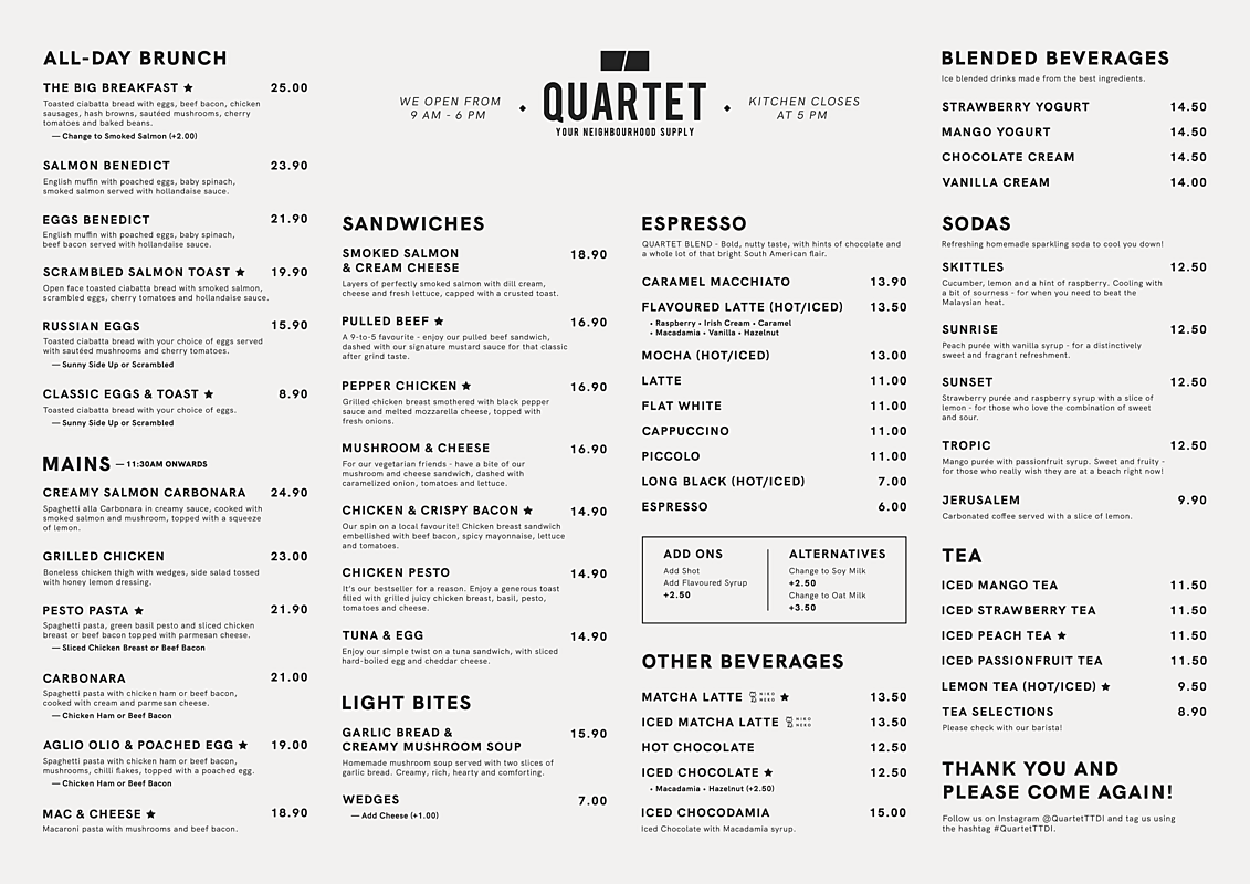 Quartet is the place where conversations are made, deals are sealed and the hub of gatherings where people from all walks of life sit and enjoy a cup of coffee over a welcoming environment with their friends or loved ones. We serve coffee that has a bold, nutty taste, with hints of chocolate and a whole lot of that bright South American flair. We are available for dine in, self pick up or delivery.
